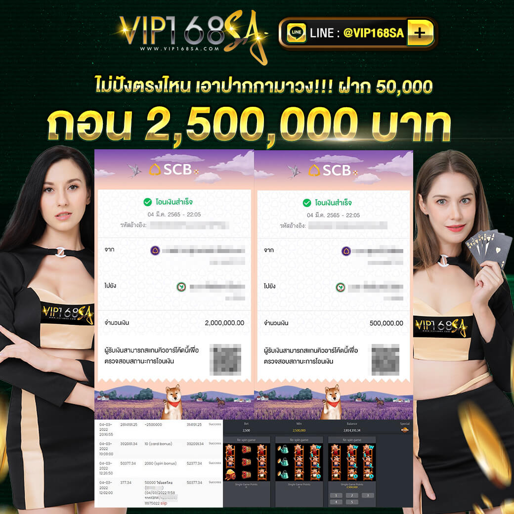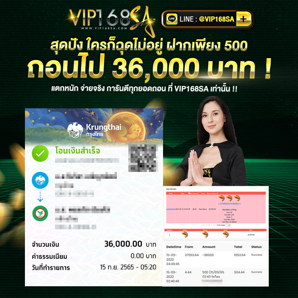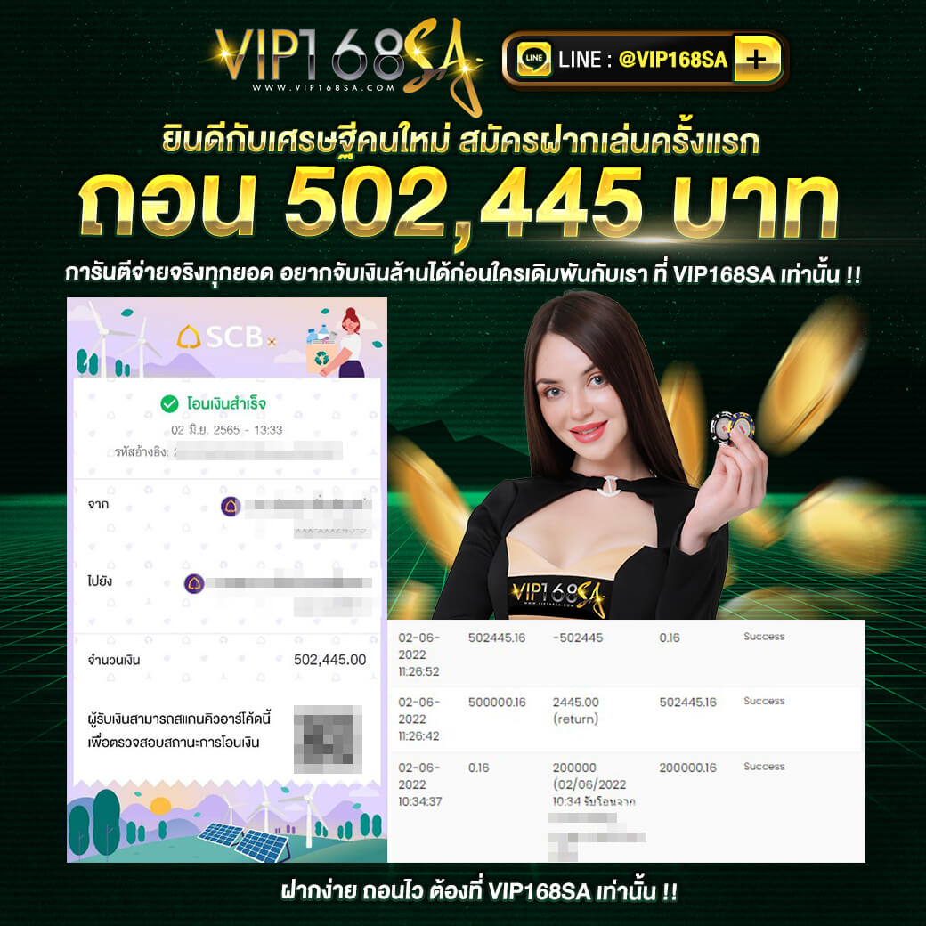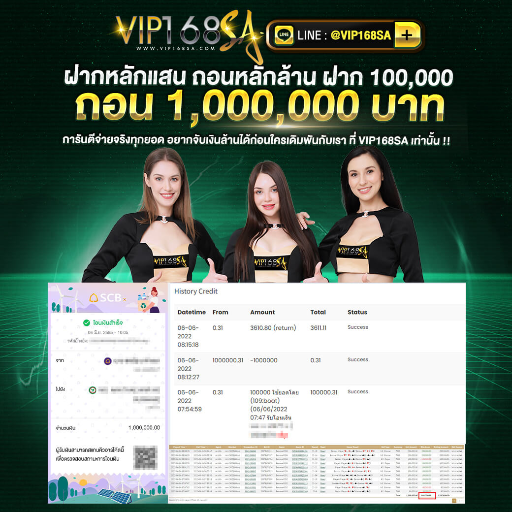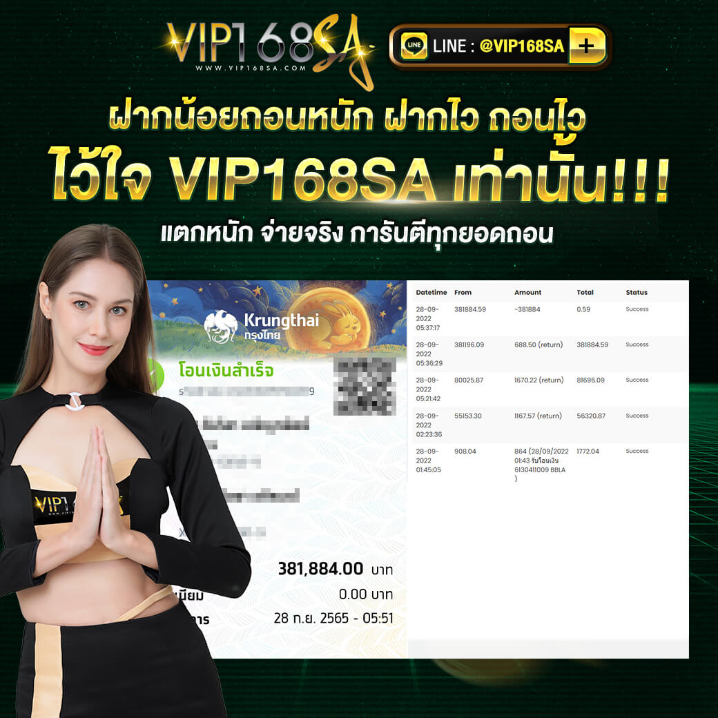 จุดเด่นที่ทำให้ VIP168SA แตกต่างคือ ระบบ ฝาก-ถอนอัตโนมัติ (AUTO) ที่รวดเร็วทันใจ ใช้เวลาเพียงไม่กี่วินาที ผู้เล่นสามารถทำธุรกรรมได้ด้วยตนเอง ไม่ต้องผ่านแอดมิน และไม่มีขั้นต่ำในการฝากถอน เหมาะอย่างยิ่งสำหรับนักเดิมพันที่ต้องการความคล่องตัวและความแม่นยำในทุกขั้นตอน